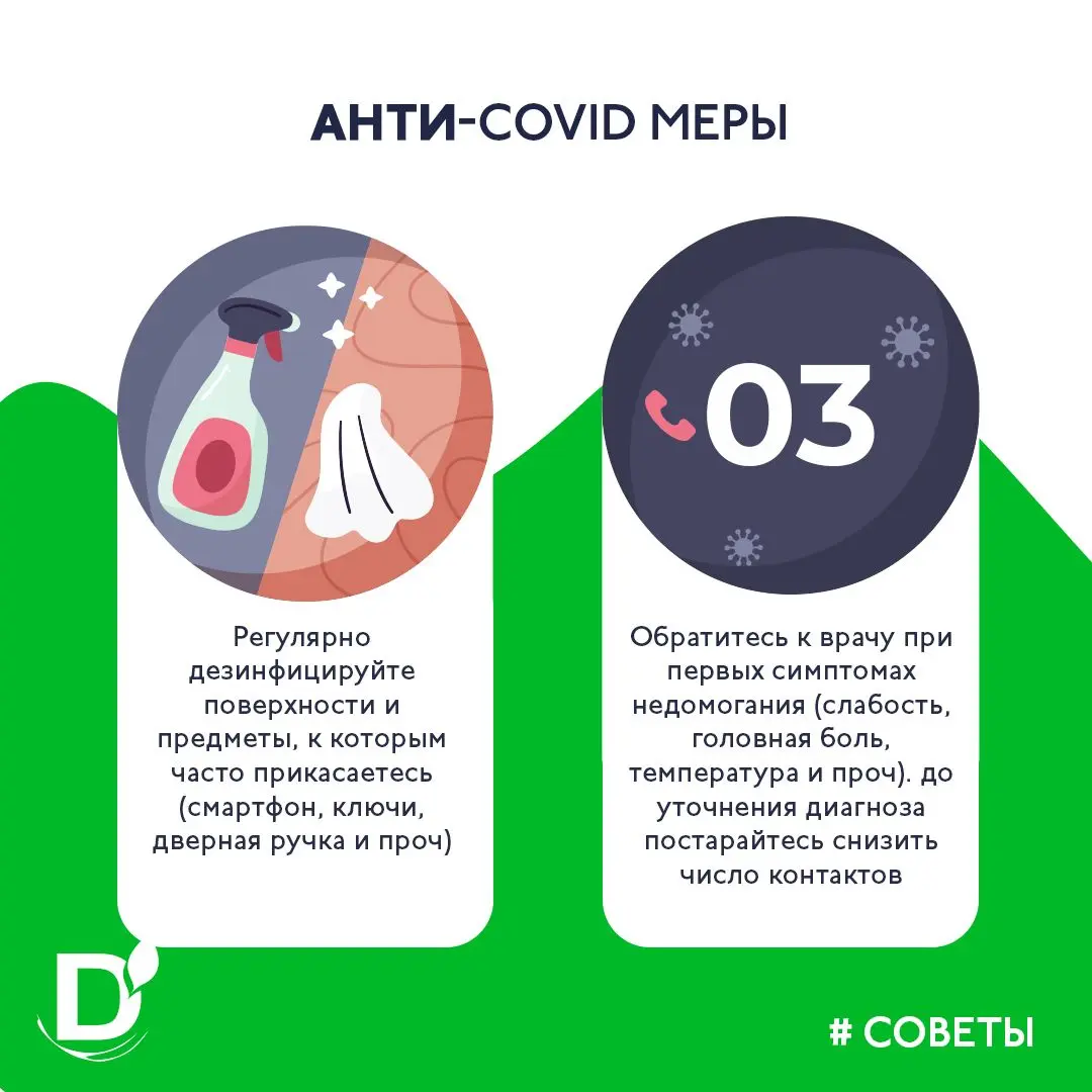 • Обратитесь к врачу при первых симптомах недомогания (слабость, головная боль, температура и проч). до уточнения диагноза постарайтесь снизить контакты с близкими