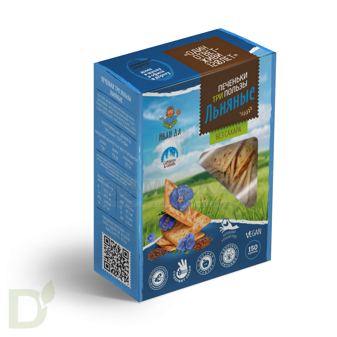 <h2>Продукты для правильного и здорового питания от Иван-ДА</h2> Компания Иван-ДА производит оригинальные и уникальные продукты, которые на все 100% соответствуют принципам здорового питания. Сырье для продукции проходит тщательный отбор, а в составе вы не найдете синтетических компонентов: все изготовлено исключительно с любовью и заботой о здоровье потребителя! Натуральность, уникальность и польза - вот главные ценности бренда.<br> <h2>Хрустящее печенье с натуральным составом</h2> Печенья Три Пользы - это бодрая хрустящесть, насыщенный и яркий вкус, питательность, сытость и польза. Ниже мы приводим подробный состав, чтобы вы могли сами убедиться в натуральности этих хрустяшек!<br> <br> Что радует: в крекерах Иван-ДА меньше углеводов, чем в обычных печеньях. Углеводы эти медленные: можно не переживать за резкий рост сахара крови после их употребления, если у вас диабет.<br> <h2>Не забудьте взять с собой</h2> Продукт послужит отличным перекусом "на скорую руку": пачечка ароматного, пряного печенья всегда должна быть наготове, на случай, если вы захотите подкрепиться.<br> <br> <b>Подходит для веганов, диабетиков, тех кто не употребляет сахар и следит за фигурой и питанием.</b><br> <br> Срок годности: 90 дней<br> Вес: 150 грамм<br> <h2>Состав печенья со льном</h2> мука 1 сорт, мука цельнозерновая, семя льна, масло растительное, соль морская, сода пищевая, лимонная кислота натуральная.<br> <h2>Пищевая и энергетическая ценность в 100 гр</h2> белки – 7,8 гр,<br> жиры – 13,9 гр,<br> углеводы – 39,5 гр.<br> пищевые волокна - 5,7 гр.<br> 315 ккал